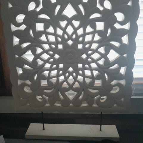 Puinen valkoiseksi maalattu mandala näköeste ikkunan eteen tai vaikka lipaston päälle koristeeksi
