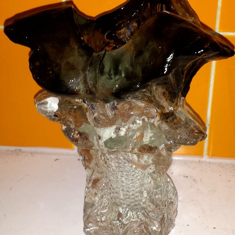 Humppila Kasvimaalla Maljakko - Pertti Santalahti, ruskeaa ja kirkasta lasia, tarra paikoillaan. Tuotannossa v. 1978-1985. Ollut koristeena. Toimitus Turun alueella mahdollinen.