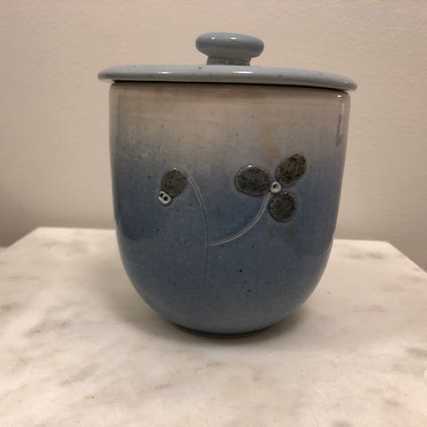 Iso Pahkalan sininen kippo, sopii myös pieneksi maljakoksi. Korkeus on 8,5cm, halkaisija on 8cm. Postitan.