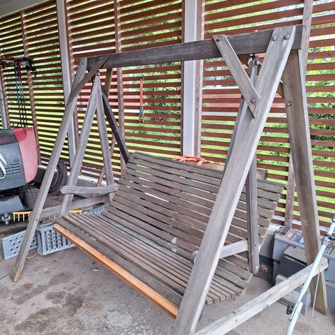 Keinuun kuuluvat osat ovat tallessa, mukaan lukien kokoamisohje. Sen valmistuspuu ei ole tiedossa. Joissain osissa, etenkin jalkojen etupinnoissa, näkyy käytön jälkiä ja kulumista. Keinumisliike on tasainen. Keinun kankaisen katon (kuvassa ilmeisesti väärin päin) ja sitä tukevat metalliset putket saa helposti irrotettua, ja katon asentoakin pystyy säätämään. Itse keinuosankin saa nostettua irti ja sen korkeutta ja asentoa pystyy myös säätämään. Osat saa myös irti kuljetusta varten, niin mahtuvat peräkärryynkin. Keinun saa hakea 124 eurolla.