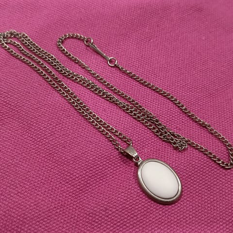 Ketjun pituus n. 50 cm, paino n. 1,85 g. Olen melko varma että ketju on hopeaa, mutta siinä ei ole (ainakaan enää) leimoja, joten myydään siis ei-hopeana. Ketju on jossain vaiheessa katkennut ja korjattu, siinä tuntuu sormin tunnustellessa pieni "pallo" korjauskohdassa.