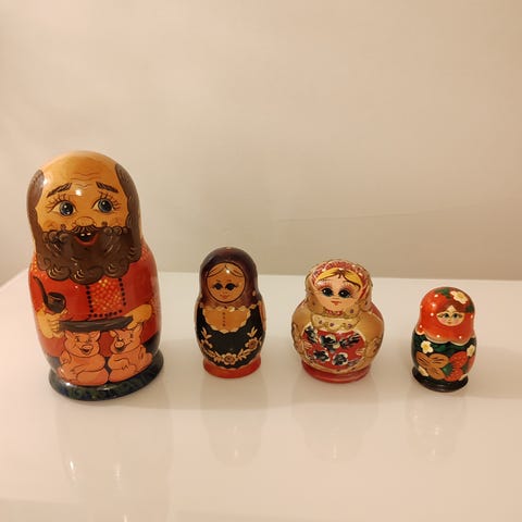 16-osainen nukkekokonaisuus vuodelta 1971. Suurimman korkeus 23 cm ja halkaisija 12 cm