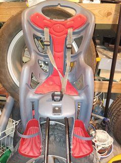 Hamax vihreä istuin pyörään, kiinnitys runkoon. Mukaan myös musta istuimen oma pehmuste, kuvanottohetkellä pesussa.