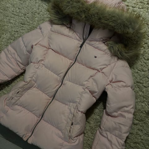 Tommy Hilfiger untuvatakki. koko S. Takki on pehmustettu ja siinä on irrotettava huppu, jossa on tekoturkisreunus. Takissa on etutaskut ja nepparikiinnitys. Taskun ja hihojen kohdalla tummia käytön jälkiä, jotka pesemällä saa pois.