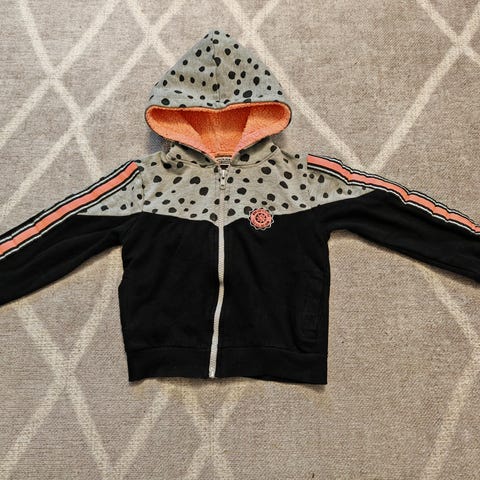 Vaaleanpunainen yksisarvis-college koossa 110cm. Edessä pari pientä väripistettä, en ole kokeillut tahranpoistoa. Vetoketjun vetisessä kulumaa.