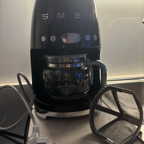 Autoomaattinen tippalukko, ajastus ja eri ohjelmia esim. vahvempi aromi. Myös kestosuodatin löytyy jota on käytetty pari kertaa, toimii myös tavallisella suodatinpaperilla mainiosti. Käyttöohje, smegin kahvimitta sekä kestosuodatin mukaan. Alkuperäistä laatikkoa ei ole.
