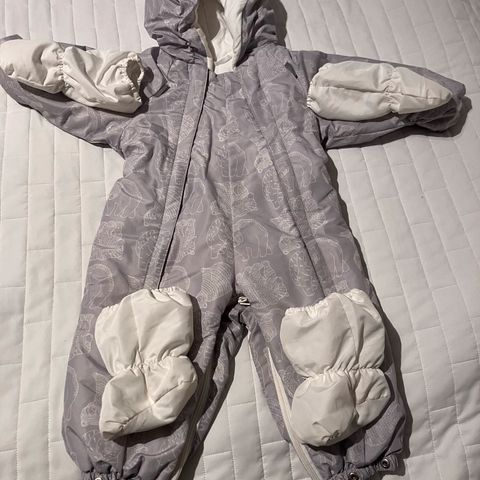 Haalari muuntuu topppussiksi (esim vaunuihin), hihat voi kääntää kiinni, kaksi vetoketjua etuosassa + lahkeissa, kuminauhat lahkeissa,