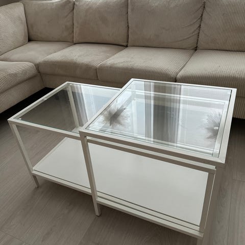 Siistissä kunnossa oleva ikean metallinen sohvapöytä/sivupöytä pyörillä. Valoa vasten näkyy pieniä naarmuja. Yleisilme silti siisti