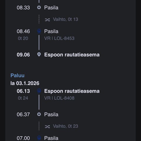 Junaliput Joensuu-Espoo ja Espoo-Joensuu 30.12.2025-3.01.2026 1 aikuinen