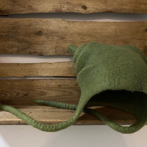 Aito lappilainen neljän tuulen hattu, jossa pohjavärinä valkoinen ja somisteena eriväriset koristenauhat jne. Koko siis 58. Pidetty yhden kerran (Salpausselän kisoissa).