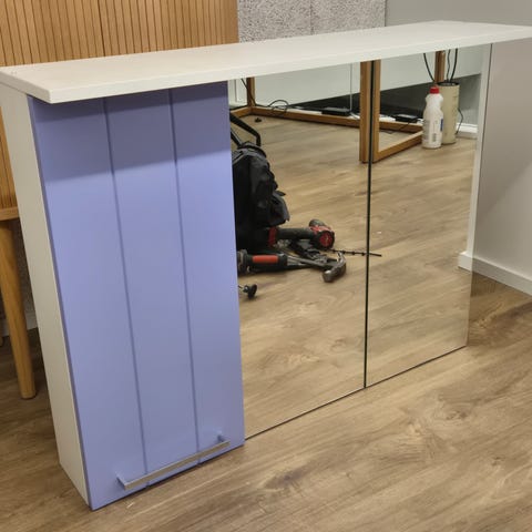 Vintage Swedbergs peilikaappi keltaisella rungolla. Peilikaapissa on kaksi peiliovea ja sisällä kaksi lasihyllyä. Sopii kylpyhuoneen tai muun tilan säilytykseen ja peilikäyttöön. Kullatut kahvat. K40 L66 S13. Vaikea lähettää