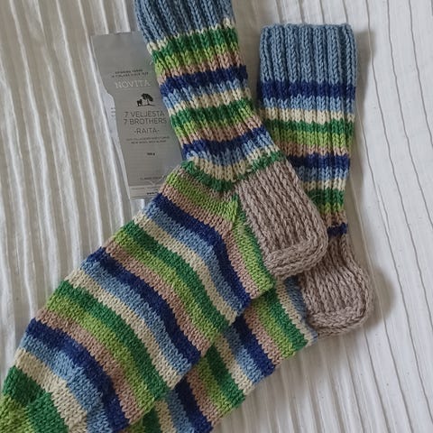 Novita 7 veljestä lanka, kestää konepesun, vahvistettu kantapää, koko 42 ja varr.pituus noin 26 cm. Postitus onnistuu. MMM.