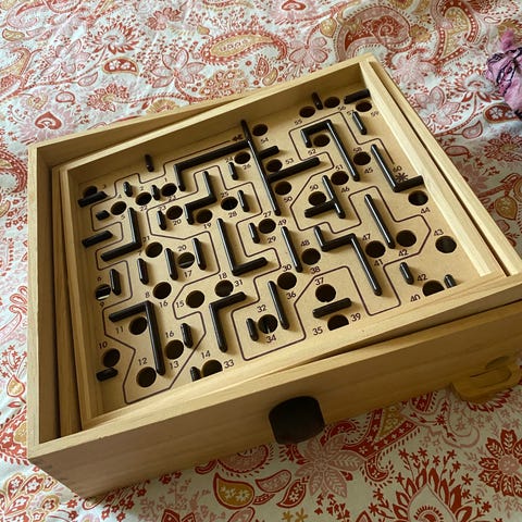 Puu labyrinttipeli, jossa on reikiä ja metallipallo. Pelissä on kätevä alusta ja se soveltuu motoristen taitojen harjoitteluun ja viihteeksi kaikenikäisille.