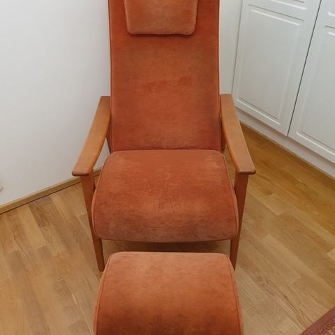 Myydään Finn Ostergaardin suunnittelema Albert -nojatuoli. Satulavöiden kiinnitys irronnut istuinosan toisesta laidasta, näkyy kuvassa. Lakkapinnassa pieniä vaurioita, näkyy kuvassa pahin paikka. Yleisilmeeltään todella siisti.