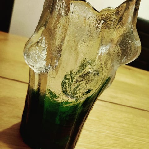 Pertti Santalahden suunnittelema lasinen maljakko, 1970-luvulta. Väriltään kirkas ja alaosasta vihreä. Korkeus noin 21 cm. Siisti ja hyväkuntoinen, ei kolhuja tai naarmuja.