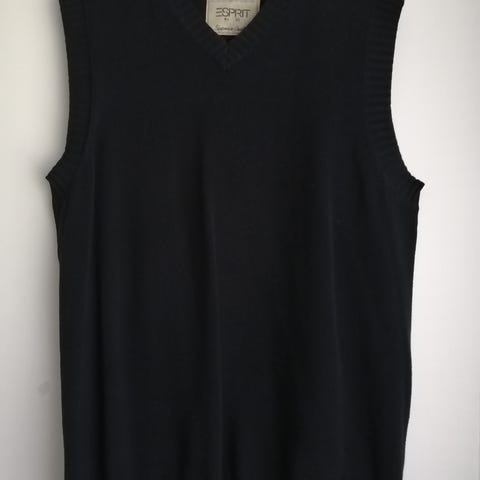 Espritin miesten ohut, musta slipoveri villasekoitetta. Klassinen malli, V-pääntie, sileää neulosta, resorit helmassa (6 cm) ja sekä kauluksessa että hiha-aukoissa (1 cm), Espritin merkki niskassa sisäpuolella. Kokonaispituus 71 cm, kainalosta hiha-aukon suulta helmaan 45 cm, hiha-aukko 22 cm, leveys kainalosta kainaloon 48 cm. Kunto uuden veroinen.
