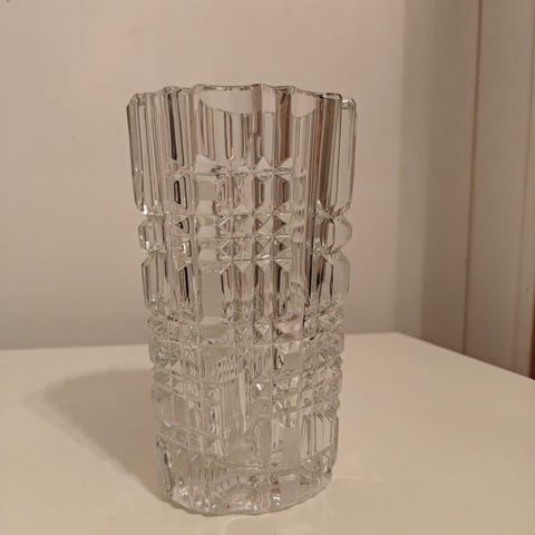 Suuri, painava ja näyttävä kristallimaljakko.