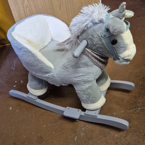 Keinuhevonen uuteen kotiin. Hyväkuntoinen ja siisti. Korvassa äänipainike, on toimiva. Vain nouto.