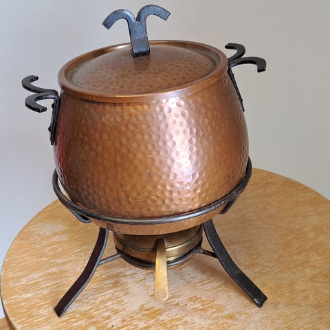 Fondue (?) kattila kahvalla, suuaukon halkaisija 13cm, korkeus 11.5cm, klommo pohjassa. Made in Portugal.