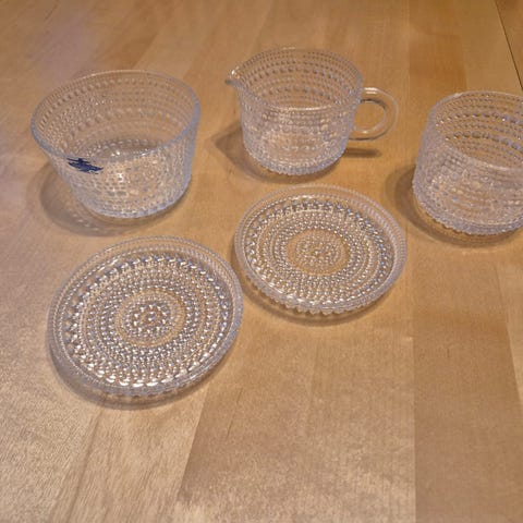 Kastehelmi sokerikko, kermakko ja kuusi lautasta. Lautasten halkaisija 14cm. Hyvässä kunnossa ja vähän käytettyä vanhaa tuotantoa.