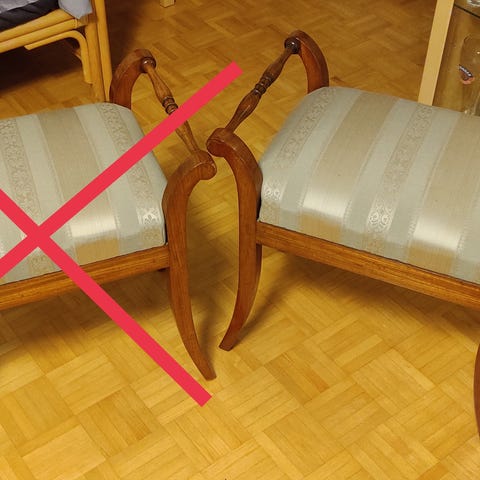 Hyväkuntoiset, aiempi omistaja ilmeisesti lakannut, tuolin pohjassa lakkauksesta jälkiä.