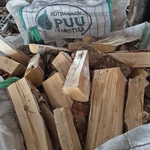 1m3 säkeissä 33cm koivuklapia. Hinta 65€/säkki. Säkkipantti lisätään hintaan.