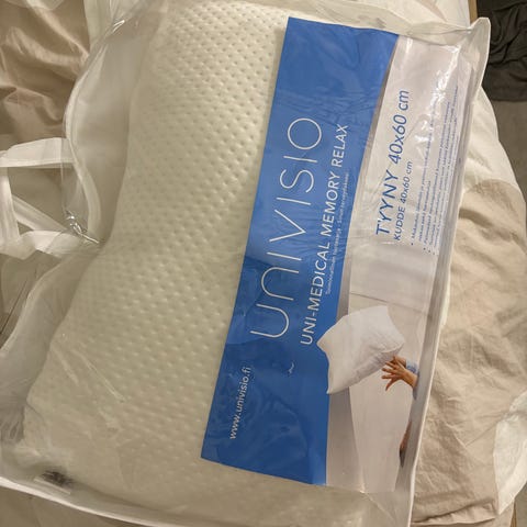 Yhden yön tyynynliinalla nukuttu Univisionin tyyny. Kuvasta lisää infoa. Aika monta on kokeiltu ja tämäkään ei ollut minulle sopiva.