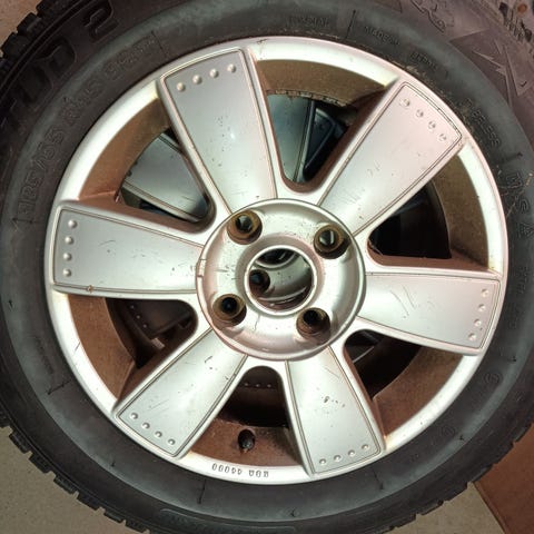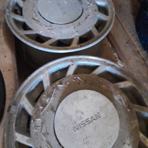 Nissan peltivanteet + pölykapselit. Päällä huonot kesärenkaat.