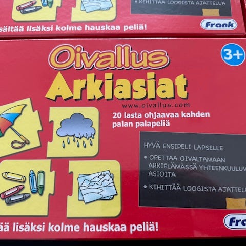 Uusia erilaisia opetuksellisia pelejä, 3 euroa kappale ja voi myös ostaa useampia alennettuun hintaan. Valitse haluamasi pelit kuvasta. Kaupan päälle minulla myynnissä oleva uusi Ulottuvuudet logiikkapeli. Postitus tai toridiili mahdollinen. Voit myös yhdistää muihin tuotteisiini ja saada lisäalennusta.