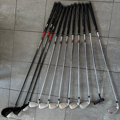 Naisten täyssetti, joka sisältää mailojen ja kantokassin lisäksi myös kuvissa näkyviä palloja, tiit ja muuta pientä sälää (pyyhe, putsasussetti jne.). Setti sopii aloittelijalle. Halutessaan mukaan M koon hanska.