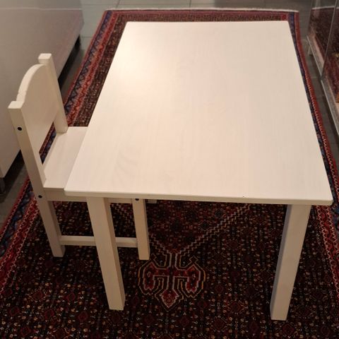 IKEA Sundvik lastenhuonekalusetti, joka sisältää mustan puisen pöydän ja tuolin. Setti on suunniteltu lasten käyttöön ja soveltuu esimerkiksi leikki- tai askartelupöydäksi. Pöydän ja tuolin pinnassa on hieman käytön jälkiä. Nouto Keravalta.