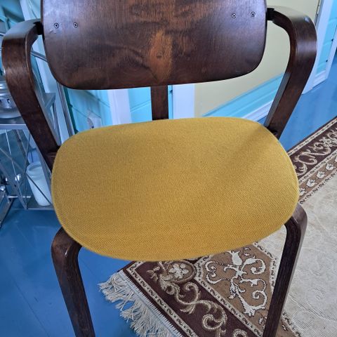Ilmari tapiovaara. Suunnittelema oppilastuoli. Nahkapäällysteinen. Kulunut, mutta ehjä.