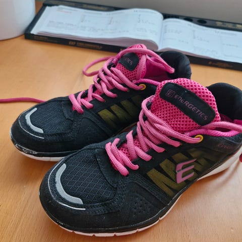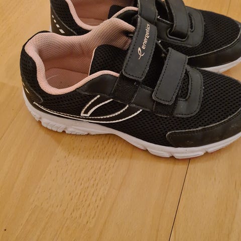 Energetics lasten kengät, koko 35. Kengät ovat mustavalkoiset, joissa on pinkit yksityiskohdat.