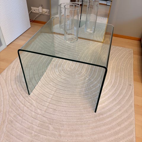 Täyslasinen sohvapöytä. Pinnassa jonkin verran naarmuja. Muutoin ehjä, ei säröjä tms.