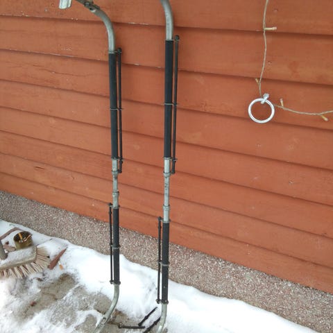 Vanhan ajan säädettävät suksitelineet. Hinta 15 euroa. Raasepori. Fiskars. Kulkeutuu lähialueille omien menojen mukana.