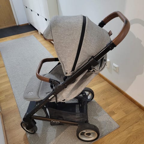 Tyylikkäät ja käytännölliset Mutsy Nexo -lastenrattaat harmaalla kankaalla ja nahkaisilla yksityiskohdilla.