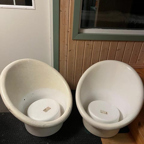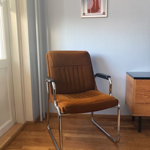Muovi on krakeloitunut sekä hieman haalistunut. Muutama kolhu löytyy myös. (Selvittelin että kuumentamalla pintaa voisi entisöidä muovin jos patina häiritsee) Alkuperäinen pehmuste hukkunut. Mukaan saa kuvissa näkyvän.
