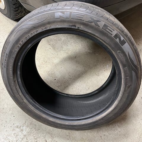 Vähän ajetut renkaat, toisesta paikattu naulan reikä.
