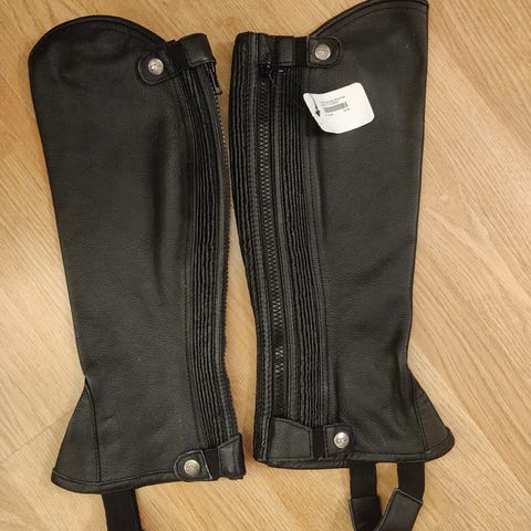 Käyttämättömät pinta nahkaiset minichapsit. Mahtuvat paksumpaankin pohkeeseen. Chapsin leveys venyttämättä paksuimmasta kohtaa 36 cm, venyke vetoketjun vieressä antaa lisää tilaa. Sisävuori kangasta, mustat. Kuminauha jalan alle, vetoketju ylhäältä alaspäin.