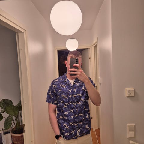 Myydään Arketin lyhythihainen kuvioitu kauluspaita koossa 50, joka vastaa kokoa M. Malli on hieman cropattu.