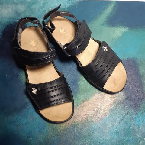 Siistikuntoiset Riekerin sandaalit, koko 39. Ulkopohjan ulkosivuissa aavistuksen verran kulumaa, muutoin ei moitittavaa.