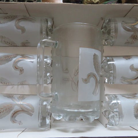 Oik.puol.Kirkas Lasikannu, jossa oranssi kahva, kork.14.5cm, pohjan halk.12.5cm 6 euroa.