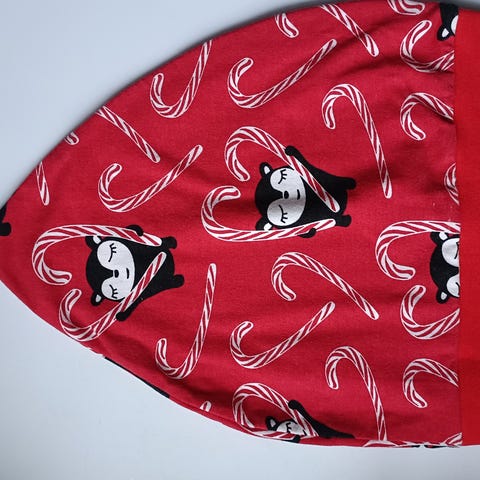 Myydään punainen ompelijalla Paapiin Myyryn karkkikepit -kankaasta teetetty lasten tonttulakki kulkusella. Materiaali joustotrikoota. Kokoarvio on noin 4 - 8v. Meni hyvin siis vielä 8-vuotiaankin päähän. Kunto uusi. Kulkusen nauha musta. Punainen resori, joka joustaa hyvin. Resorin leveys noin 23cm. Lakin korkeus noin 28cm ilman kulkusta.