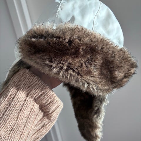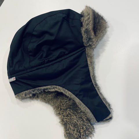 Siistikuntoinen Reima karvalakki/ karvahattu ruskeanharmaalla karvalla. Tässä mallissa karva on päällysmateriaalina ja vuori on tikattua kangasta. Solmitaan nauhoilla leuan alle.