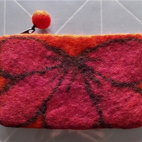 Perinteiseen Karjalan koristekuvioon neulottu vuorillinen silmälasikotelo, valmistaja Punainen Rukki, design Kaisa Mäkelä, 100 % villaa, mitat 8*15 cm.