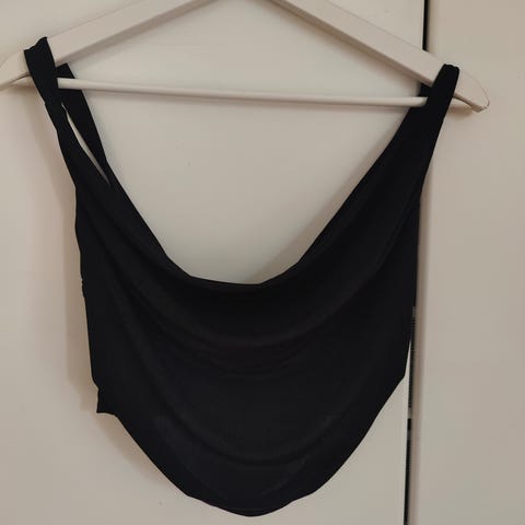 Jännä musta biletoppi. Selkäpuolella nuo ketjut. Trikoota. Koko S. Valo vääristää sävyä. On siis ihan musta,ei tuollainen harmaa kuin kuvassa.