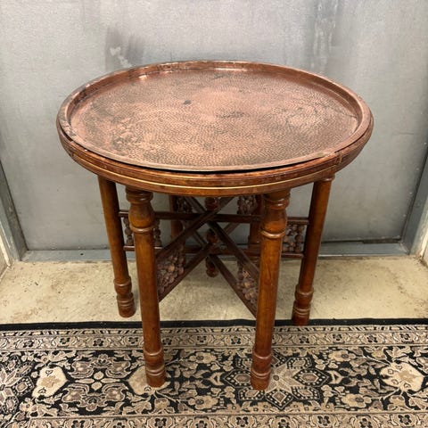Kätevä pöytä eri käyttötsrkoituksiin, kokoon menevä puujalat. Messinki tarjotin, halkaisija 50cm. Pöydän korkeus 39cm. Patinaa jaloissa ja tummuutta tarjottimessa. Nätti kuitenkin. Jalat voi maalata halutessaan ja messinkiä (?) kiillottaa. Vanha 40v.