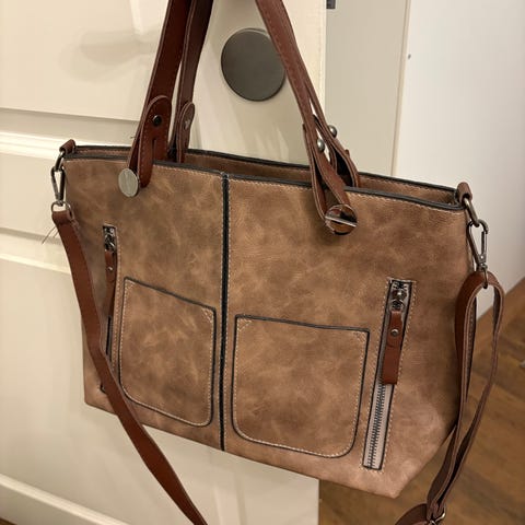 H&M:n olkalaukku naisille, valmistettu tekonahasta. Laukku on vaalean värinen ja siinä on säädettävä olkahihna. Sisätiloissa on vetoketjullinen tasku ja laukku suljetaan läpällä, jossa on nappikiinnitys. Laukun pinta on ruutukuvioitu. Mitat l. 24 cm, k. 18 cm.