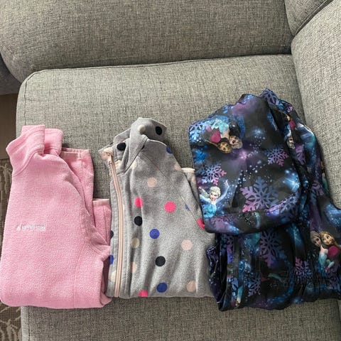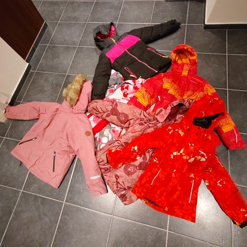 Takkipakettiin kuuluu korallinvärinen Icepeak toppatakki koko 128cm, musta Icepeak kuoritakki koko 128, pinkki fleece koko 130 sekä H&M ihana punainen pitkänmallinen sadetakki 134/140 cm. Kaikki 30e.