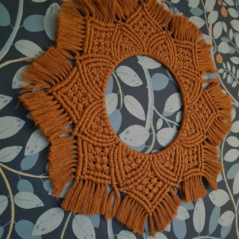 Kaunis käsintehty makramee-seinä/pöytäkoriste, solmittu laadukkaasta puuvillalangasta. Koristeessa on mandala-kuvio, joka tuo kotiin rauhallista ja luonnonläheistä tunnelmaa.